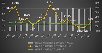 在歷經(jīng)10年的投資高速增長后,市政公用設(shè)施建設(shè)大體完成,2012年之后投資開始進(jìn)入穩(wěn)定增長通道,近幾年的投資額基本穩(wěn)定在2萬億左右,占同期全社會固定資產(chǎn)投資總額的比例持續(xù)下降。2016年全國市政公用設(shè)施建設(shè)固定資產(chǎn)投資總額為2.1萬億元,占同期全社會固定資產(chǎn)投資總額的3.4%。